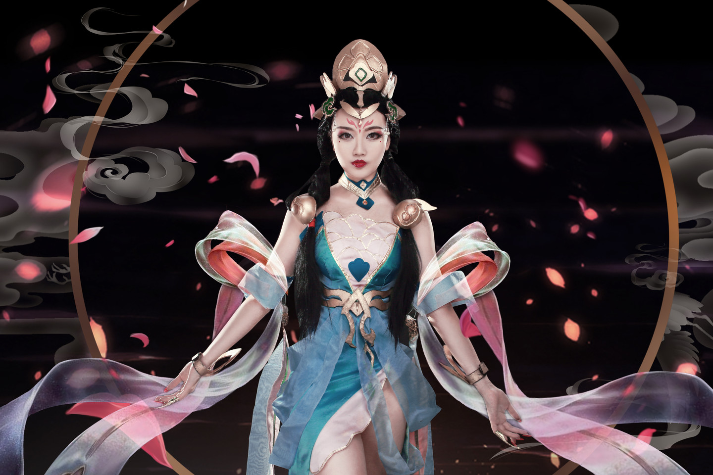 杨玉环本来就是贵妇形象,所以妆容偏艳丽。道具也非常细致漂亮,她手里拿的是琵琶,高贵典雅。飘舞起来的衣袂,给整个人都增添了仙气。另外,后期也做的很棒,完全把杨玉环这个英雄融入到了游戏背景中,我们看的人就觉得很赏心悦目。